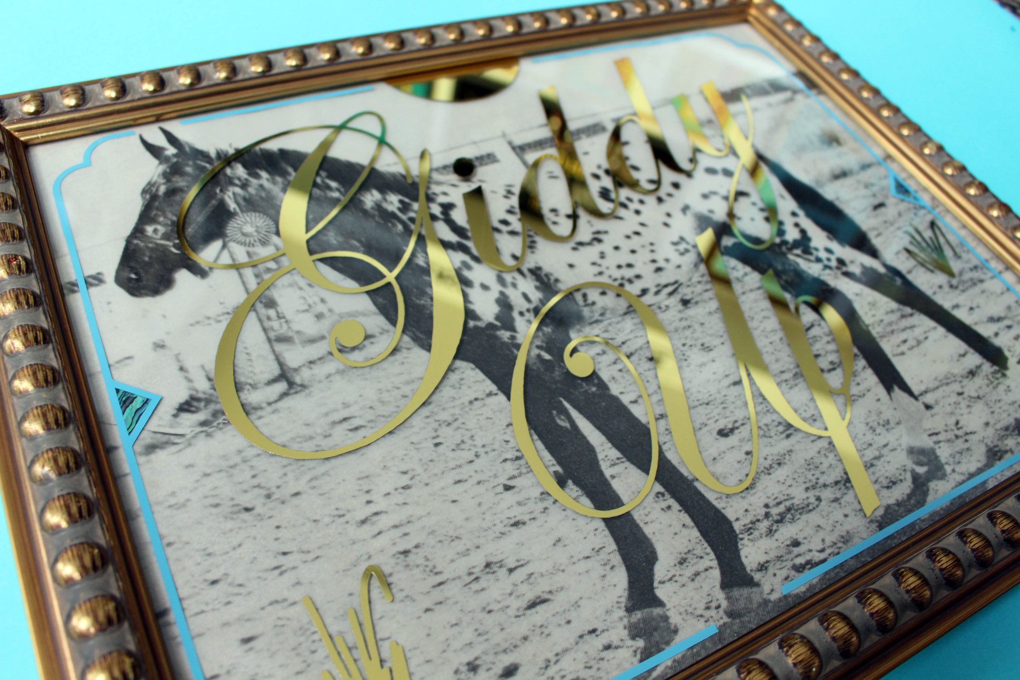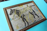 23ct yellow gold leaf, Paua mother of pearl shell, Tan background Appaloosa.