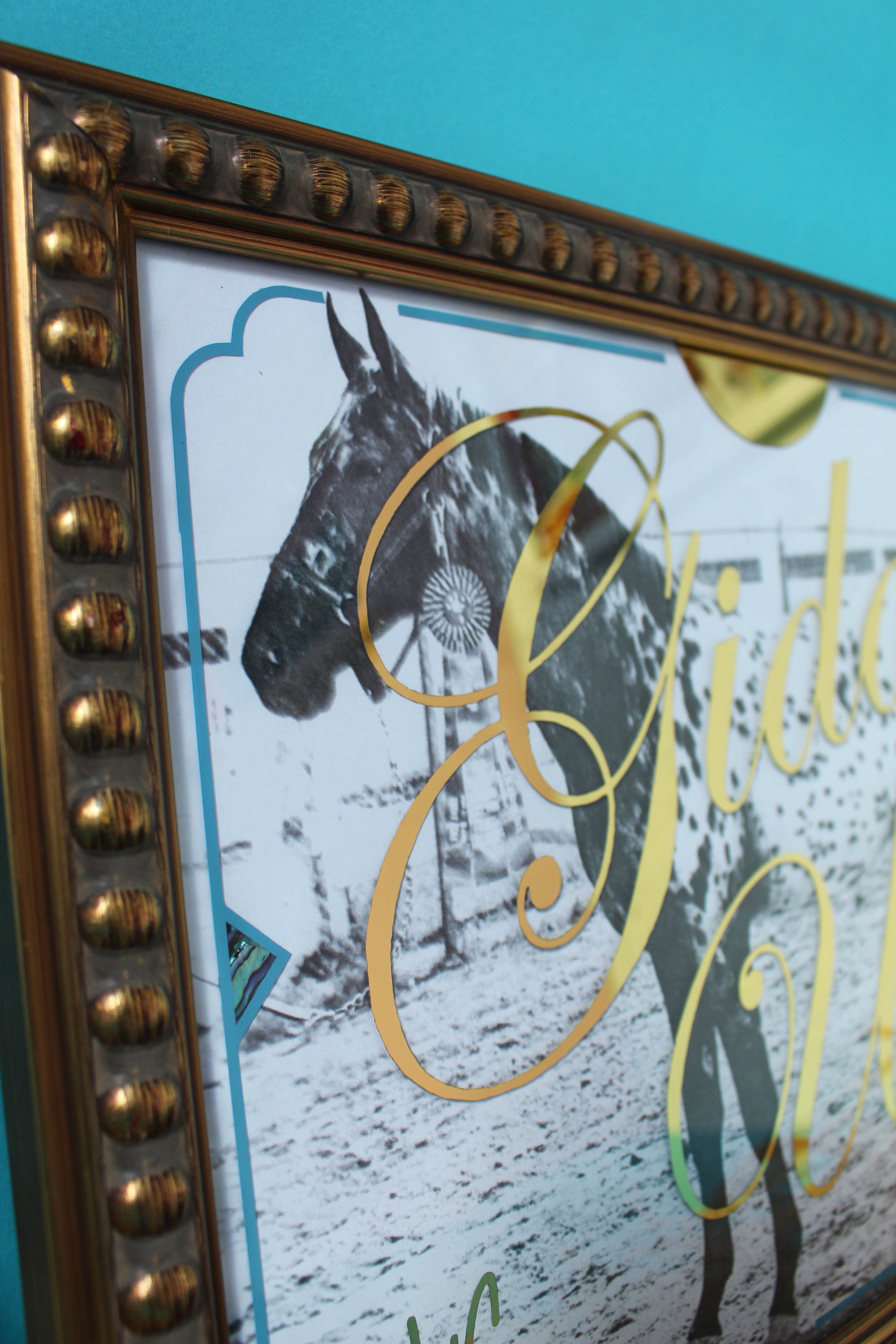23ct yellow gold leaf, Paua mother of pearl shell, White/black Appaloosa.